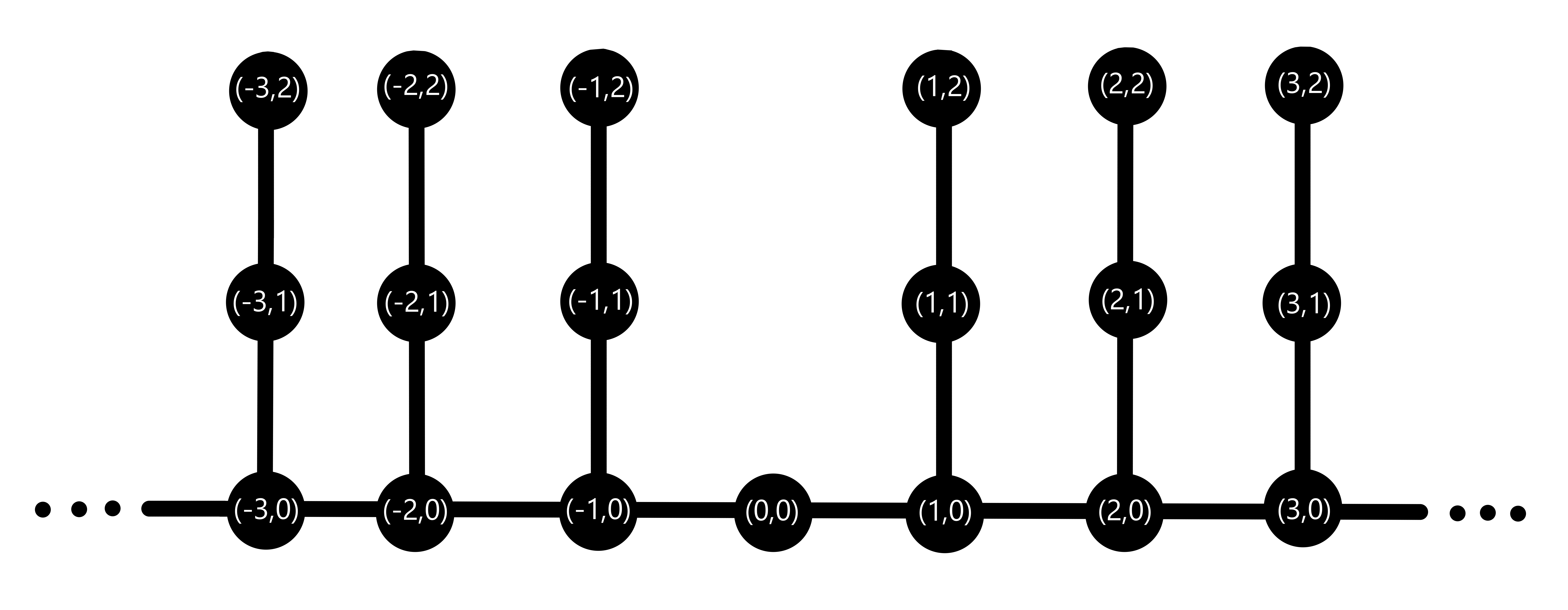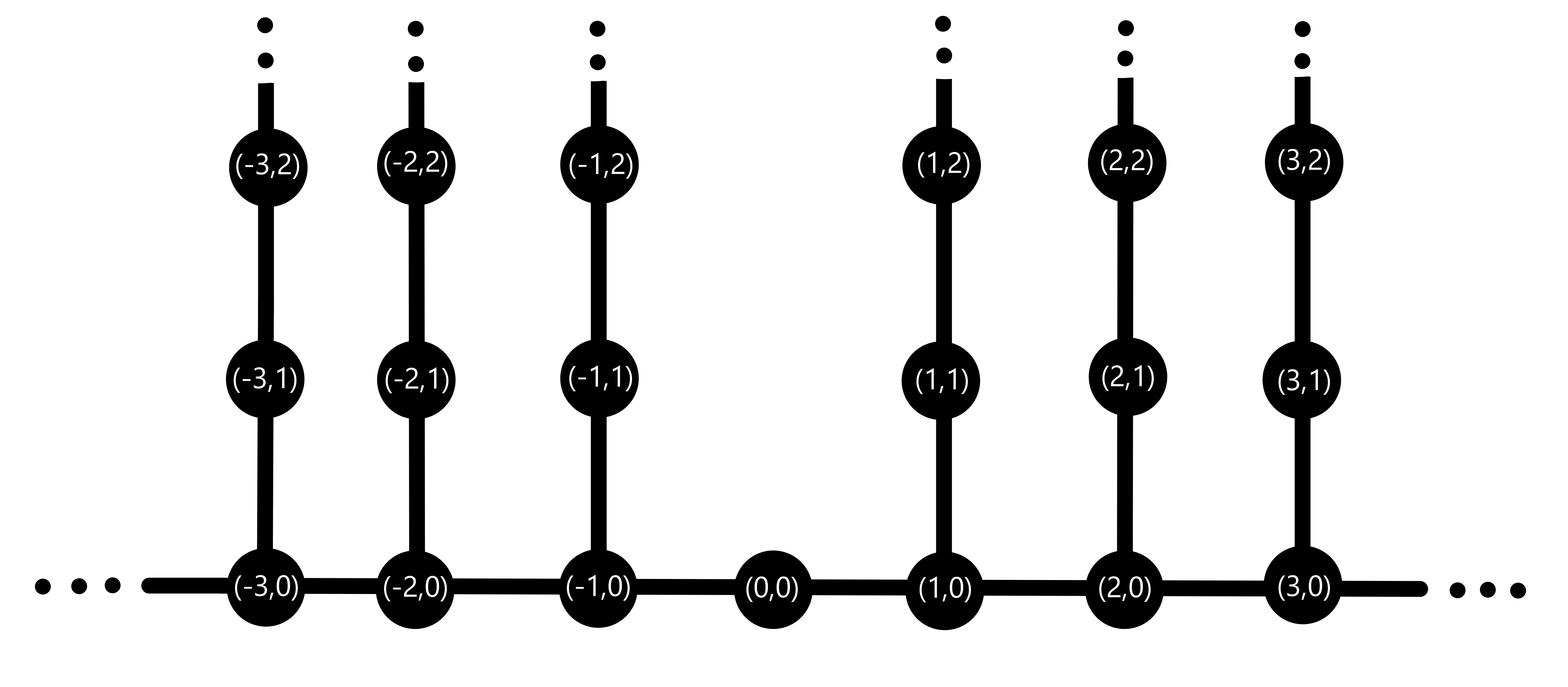 As promised, I’ll extend the previous theorem to a larger tree. Let \(T\) be a 2-ended tree with vertices uniquely labelled with \((n,m)\), with \(n\in\mathbb{Z}/0\) and \(m\in\mathbb{Z}\cap[0,h]\) where \(h\) is any natural number, as well as a vertex labelled \((0,0)\). The tree \(T\) will also contain edges between the vertices \((n,0)\) and \((n+1,0)\) for any \(n\), and an edge between vertices \((n,m)\) and \((n,m+1)\) for any \(n,m\). For convenience, this is illustrated here: