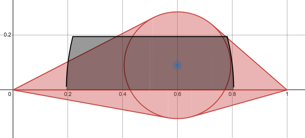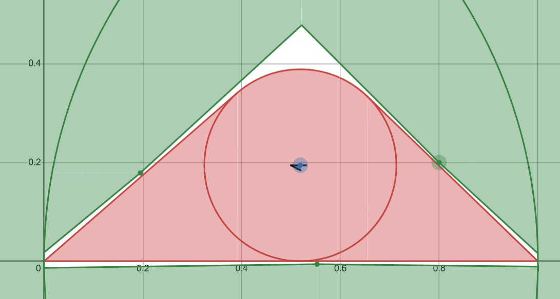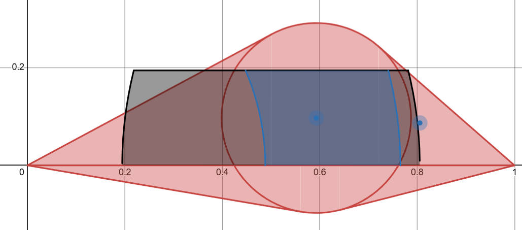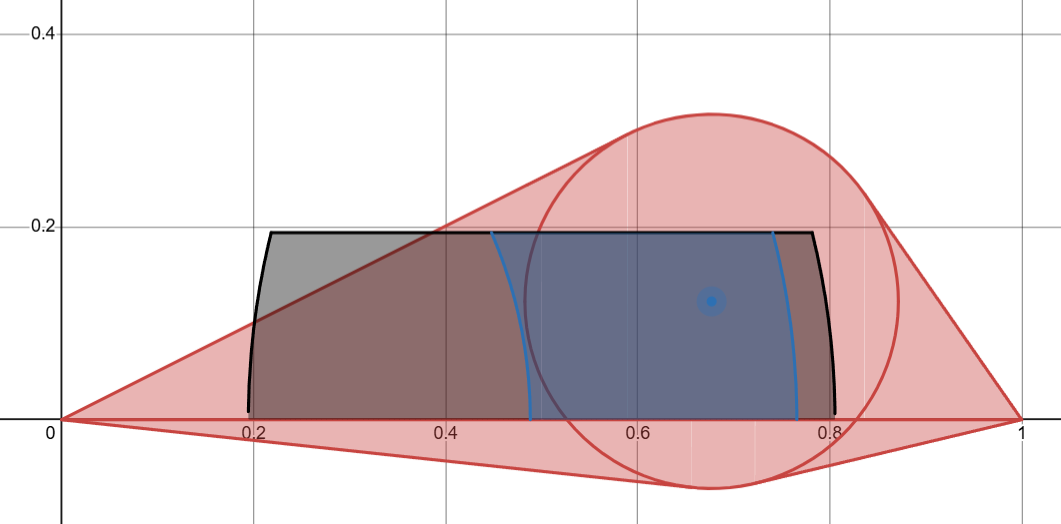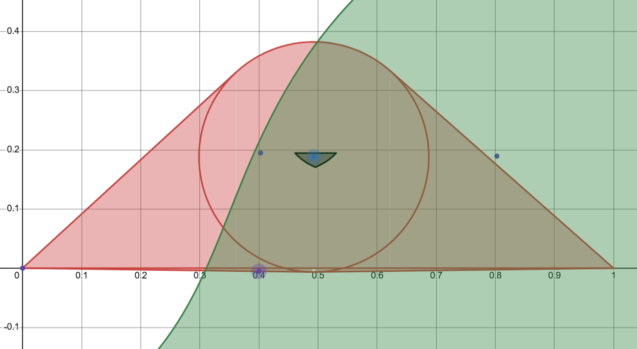 Finally, everything has been defined, and things can finally get interesting. For this section, let’s assume that \(m\) and \(g\) are fully intersecting. Without loss of generality, we may assume that \(c\) is above the \(x\)-axis. Since \(m\) has a radius of \(r\), we may conclude that \(c_y\in [0,r]\). Additionally, we know that no point may be more than one unit away from another, so \(c\) must be within a distance of \(1-r\) from both the origin and \((1,0)\). The possible locations of \(c\) are shown here in black: