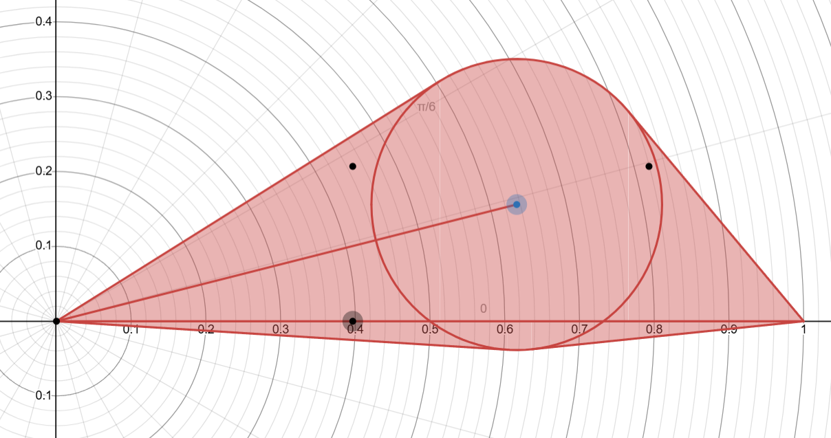 Along the same lines, we can allow \(d’=\sqrt{\left(1-c_x\right)^2+c_y^2}\) to be the distance from \(c\) to \(\left(1,0\right)\), and let\(\theta_c’=\arctan\frac{c_y}{c_x-1}\) be the angle formed by \(c\) and \(\left(1,0\right)\). Similarly, let’s define \(\theta_d’ = \arcsin\left(\frac{r}{d’}\right)\), so that the lines passing through \(\left(1,0\right)\) tangent to \(m\) are at angles of \(\theta_c’+\theta_d’\) and \(\theta_c’-\theta_d’\), and have lengths of \(\sqrt{d’^2-r^2}\).