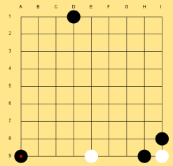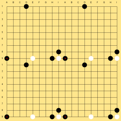 A "wrapped around" version of the previous board. Here, the stone placed on I9 is adjacent to A9, and the game would be over if black were to play at I1.The two remaining rules are obscure and almost never applied. They are: