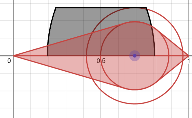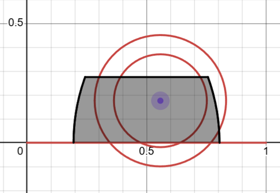 I’m going to go on a brief tangent here, and it’ll be clear soon why this is important. Consider the possible elements of \(\left[L,M\right]\) with \(M\) and \(L\) intersecting. The curve \(M\) has a minimum radus of \(\frac{1}{\pi+2}\), but it has a maximum radius of \(\frac{\sqrt{2}}{\pi+2}\). Let’s locate \(L\) on \(\left\langle[0,0],[0,1]\right\rangle\). Without loss of generality, let’s assume \(M\) is centered above the \(x\)-axis, and so must have a center with a \(y\)-coordinate less than \(\frac{\sqrt{2}}{\pi+2}\). Additionally, there must not be a point more than 1 unit away from either endpoint of \(L\). The possible locations for the center point of \(M\) is shown here in black: