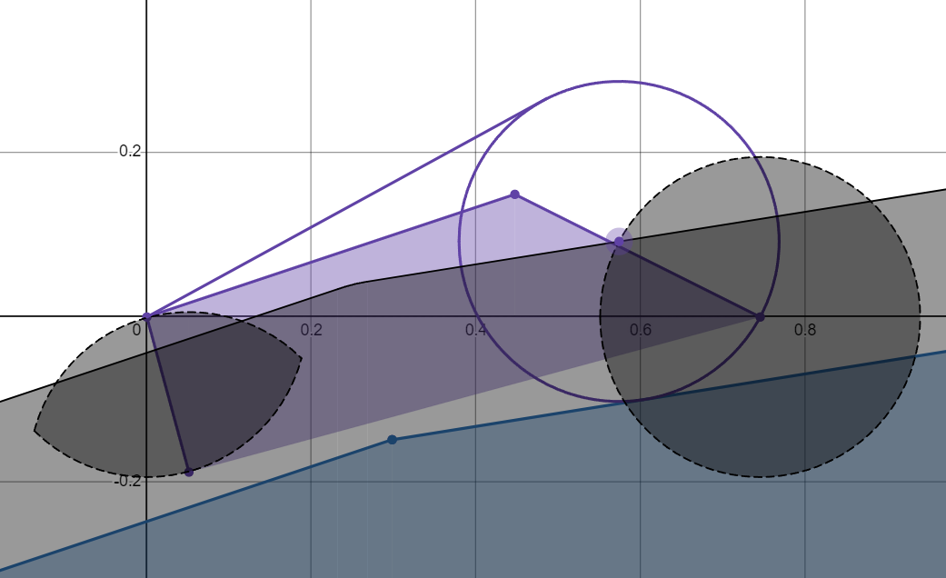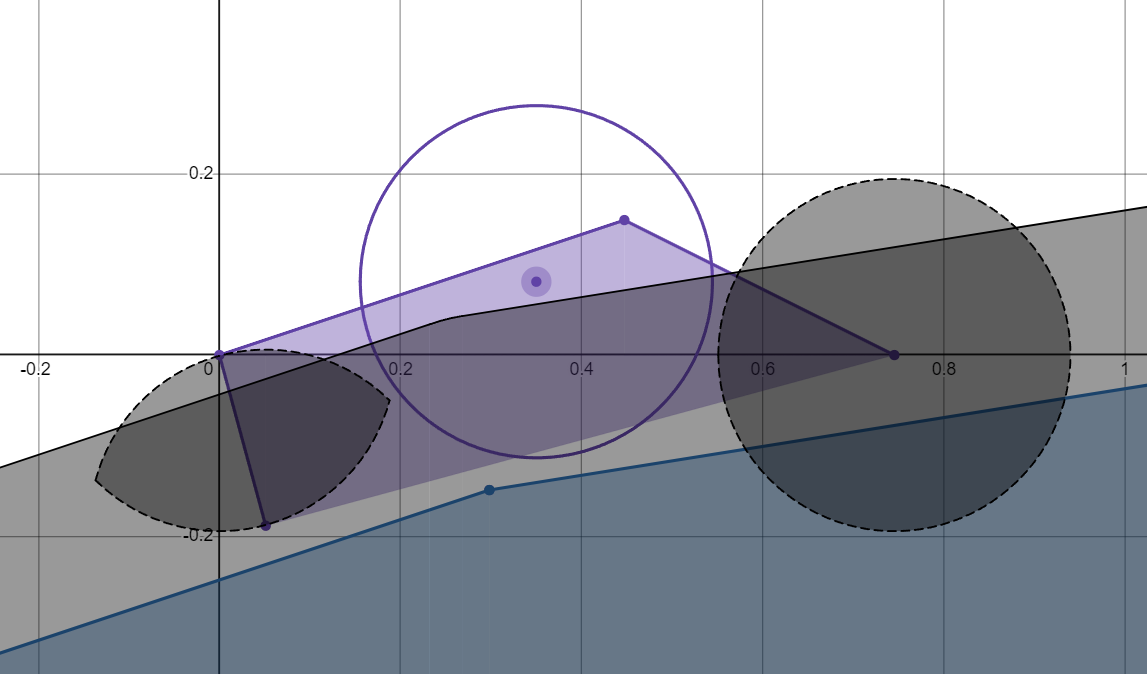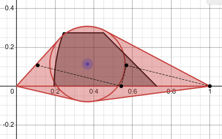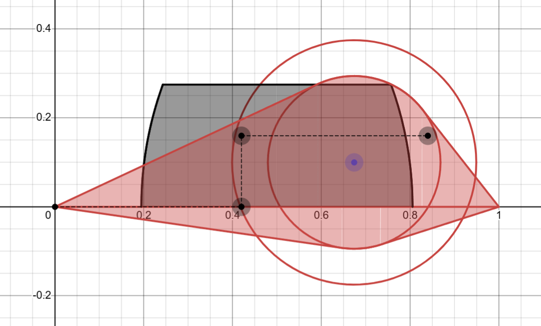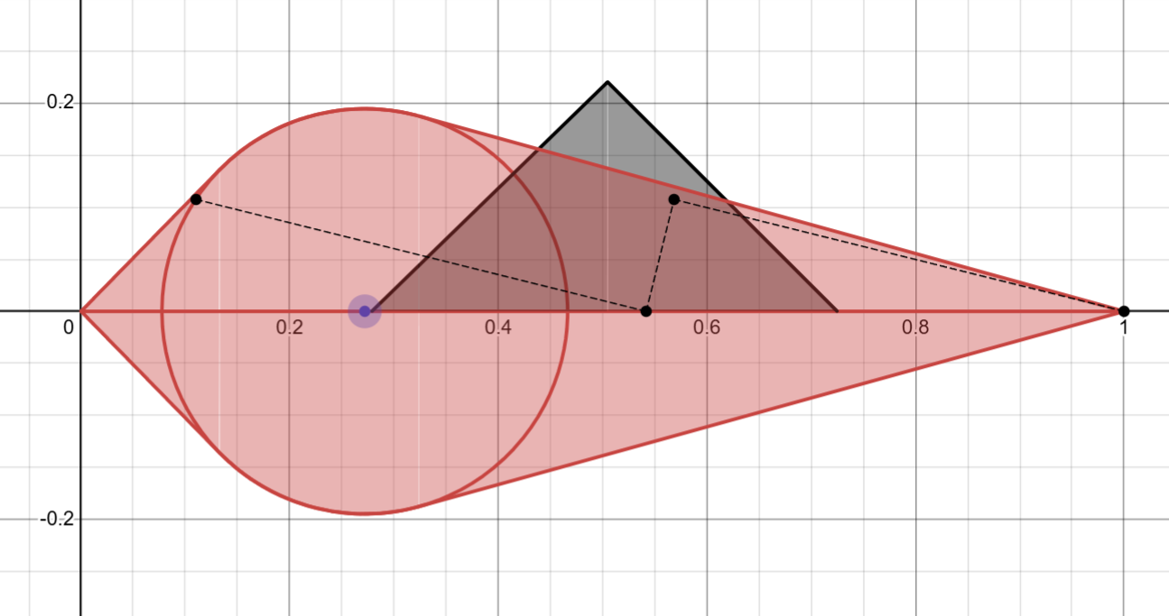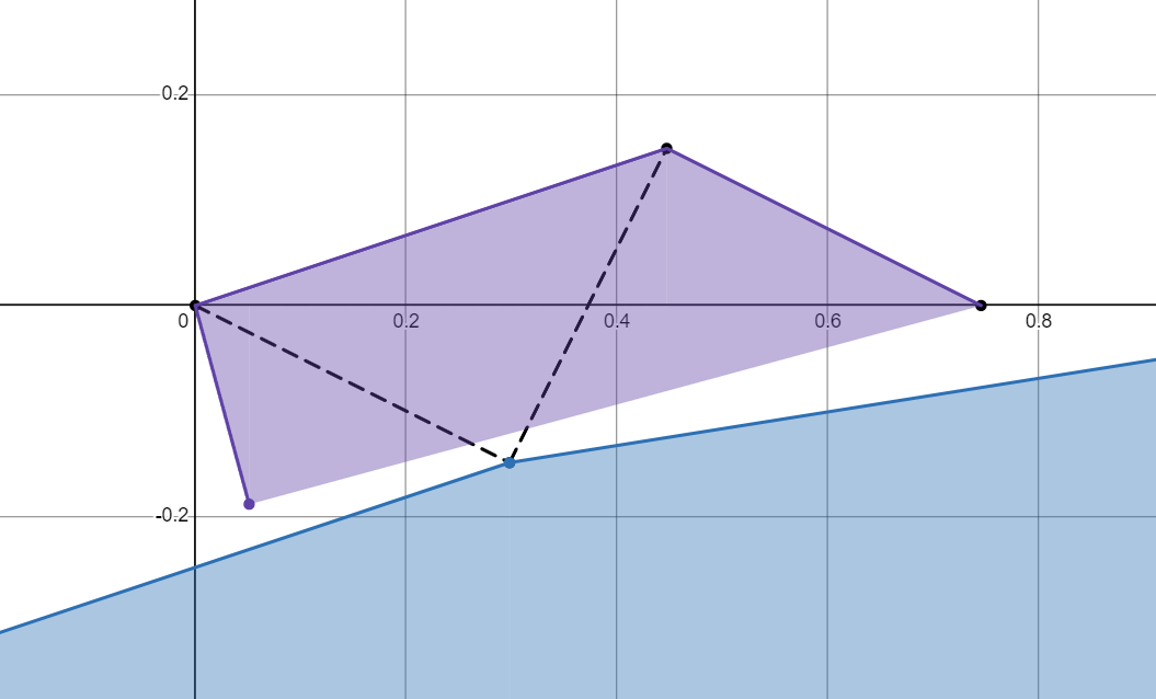These two lines intersect at a point that is approximately \((0.306014,0.167131)\). Regardless of where \(M\) is located, this point must be included in the convex hull of \(M\) and \(z’\). Additionally, I’ve been rounding down, meaning that this point really is included, not just one close to it.