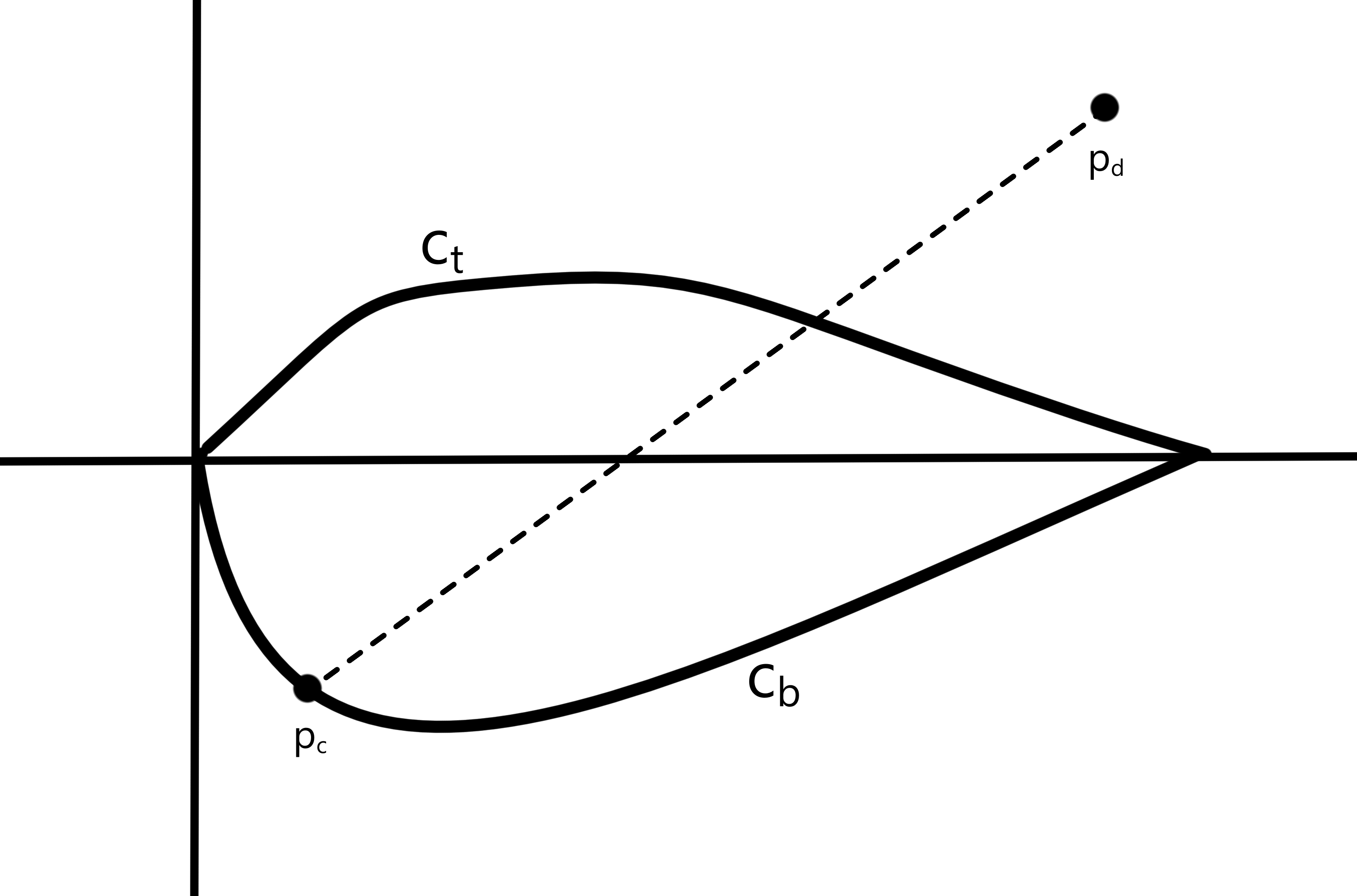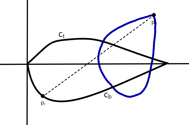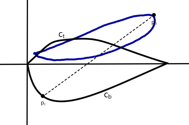 As of right now, \(c\) only has points defined at \(\left(0,0\right)\) and \(\left(1,0\right)\), and so this setup is symmetric around the \(x\)-axis and \(x=0.5\). Therefore, assume without loss of generality that \(p_d\) has a \(y\) coordinate greater than or equal to 0, and a \(x\) coordinate greater than or equal to 0.5. If \(p_c\) lies on \(c_t\), there is a point on \(c_b\) that is even further from \(p_d\), so assume \(p_c\) lies on \(c_b\). In total, the situation looks like this: